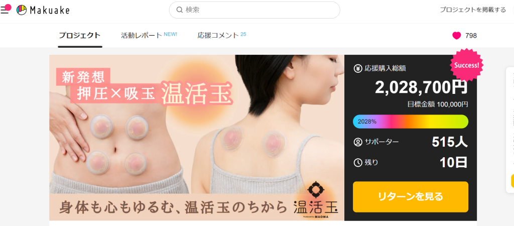 現在クラウドファンディングサイト”MAKUAKE”で実施中の温活玉ですが、多くのサポーター様のご支援でプロジェクト終了まで残り10日の本日時点でサポータ―様500名以上、ご支援総額200万円超えを達成しております。