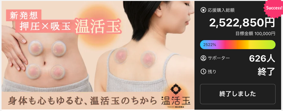Makuakeで実施しました「温活玉」 のプロジェクト↑は12/29をもちまして終了し、626名のサポーター様 より総額252万円を超えるご支援を頂きました!